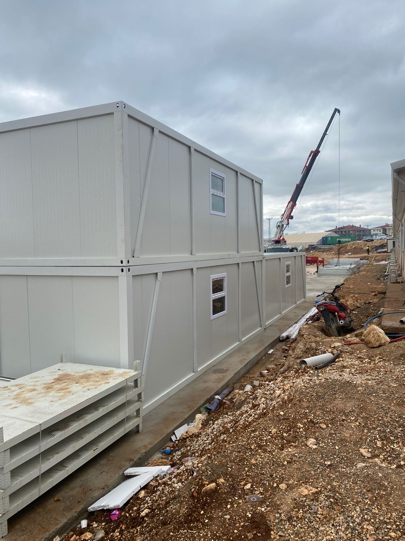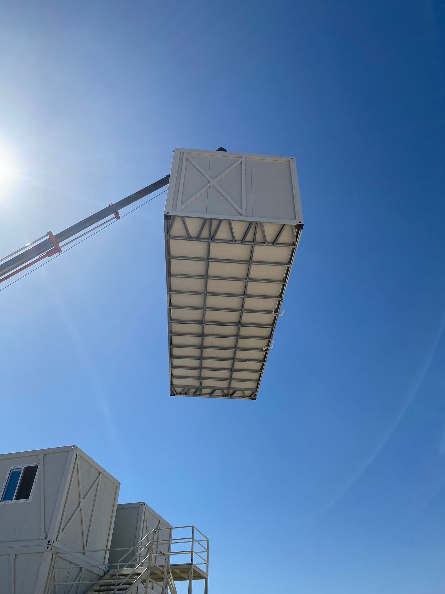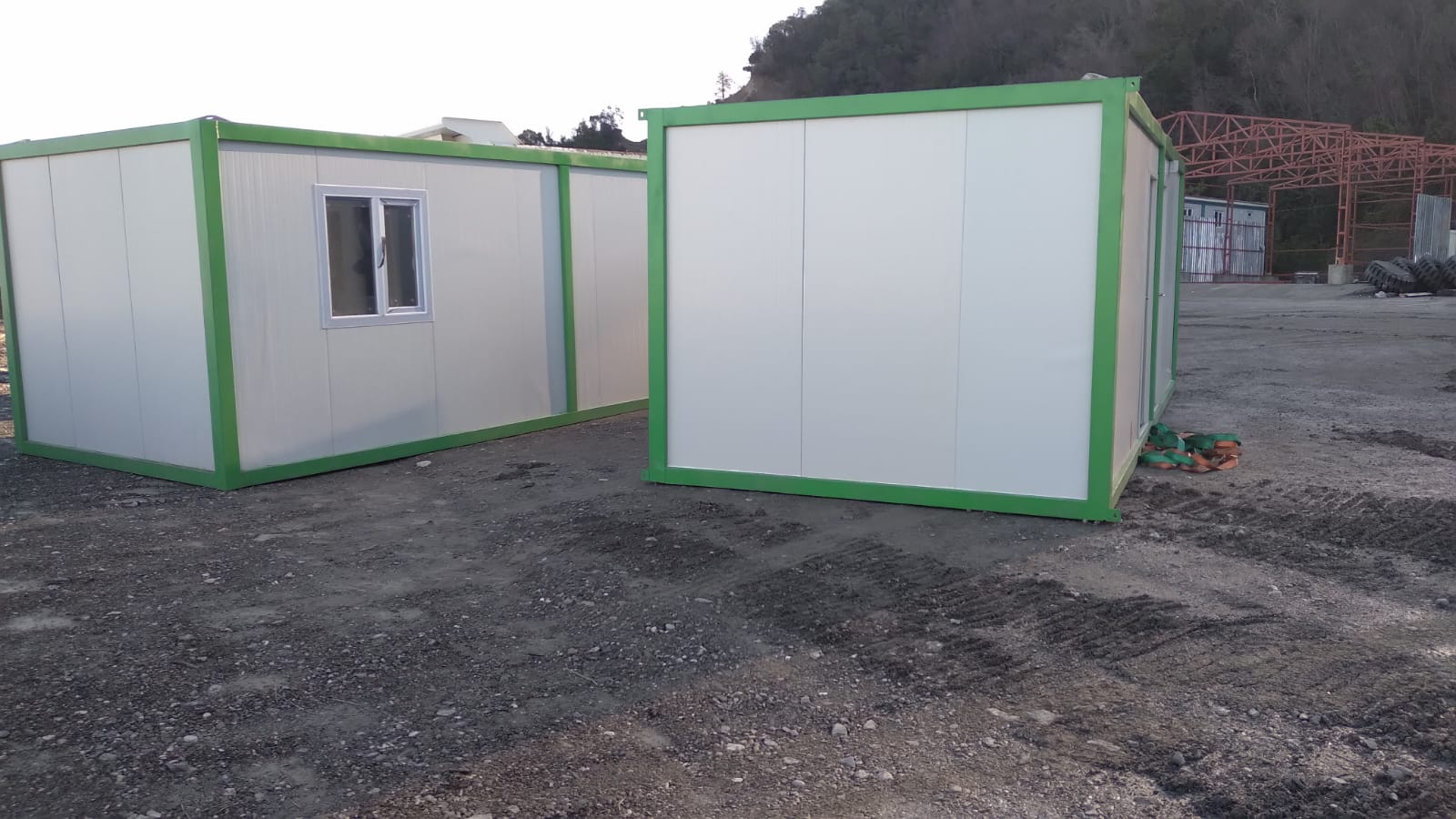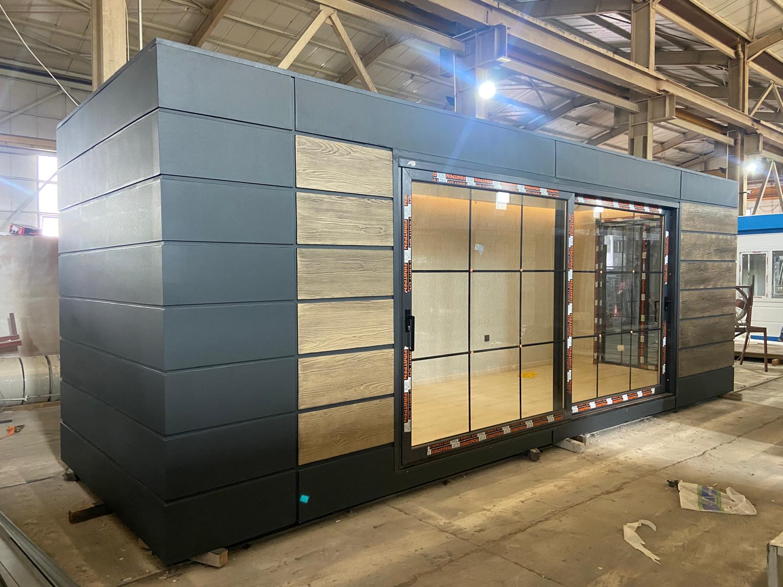 Rozładunek i montaż odbywają się z użyciem dźwigu lub maszyny zdolnej do podniesienia dachu, co zapewnia precyzyjne ustawienie i pełne bezpieczeństwo operacyjne. Po złożeniu moduł ma wymiary 600 × 240 × 280 cm, z oknem na jednej krótkiej ścianie i drzwiami na przeciwległej. Konstrukcja wykonana jest ze stali DX51 ocynkowanej i malowanej proszkowo, ściany i dach z płyt warstwowych PIR 50 mm, a podłoga z rusztu stalowego, 100 mm wełny skalnej Knauf, płyty drzazgowo‑cementowej i wykładziny PCV.