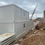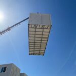 Rozładunek i montaż odbywają się z użyciem dźwigu lub maszyny zdolnej do podniesienia dachu, co zapewnia precyzyjne ustawienie i pełne bezpieczeństwo operacyjne. Po złożeniu moduł ma wymiary 600 × 240 × 280 cm, z oknem na jednej krótkiej ścianie i drzwiami na przeciwległej. Konstrukcja wykonana jest ze stali DX51 ocynkowanej i malowanej proszkowo, ściany i dach z płyt warstwowych PIR 50 mm, a podłoga z rusztu stalowego, 100 mm wełny skalnej Knauf, płyty drzazgowo‑cementowej i wykładziny PCV.